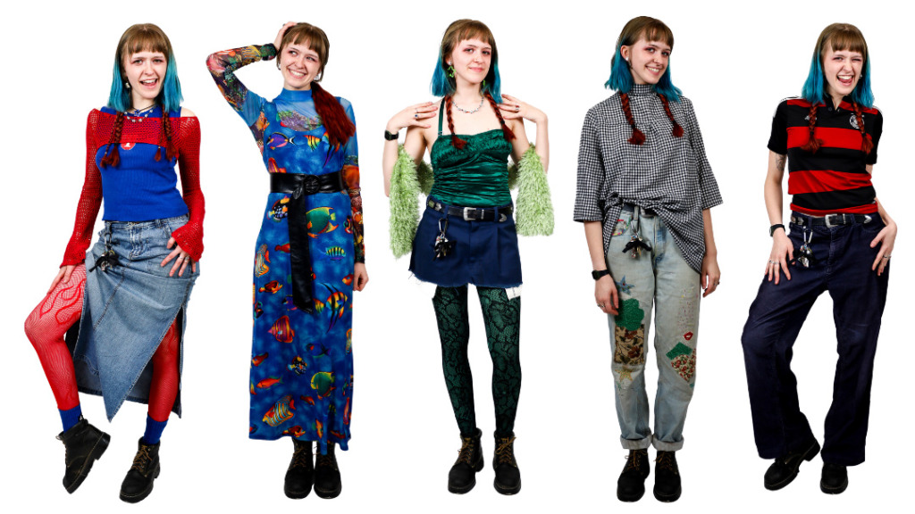 Tasha Moller: Dynamic, colourful, garbage. I like to take things off the street. I like to wear clothes that people normally throw out. I turned a freezer bag into a top once. I get a lot of confused reactions from people. I like to wear things in ways that they are not intended to be worn. I’ll wear things backwards. I like taking things that are overlooked and adding value back into them.