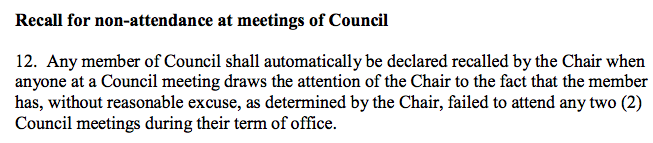 The DSU’s constitution includes a clause saying that pending the chair’s discretion, any member of council who fails to attend two council meetings without providing reasonable excuse shall automatically be declared recalled when anyone at a council meeting brings this to the chair’s attention.