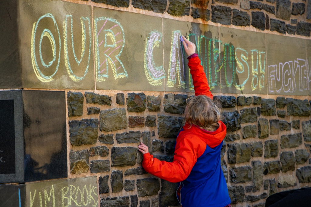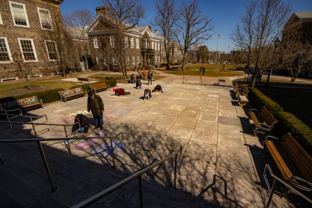 Attendees chalked the pavement in front of the Hicks before marching and chanting along University Avenue until they reached Robie Street.