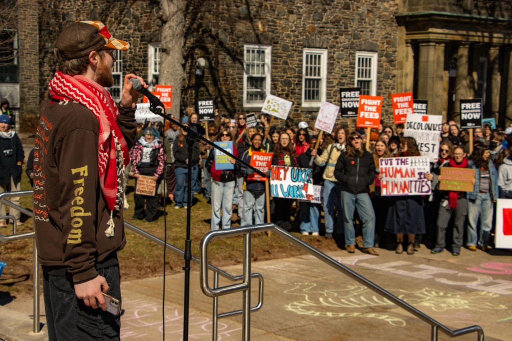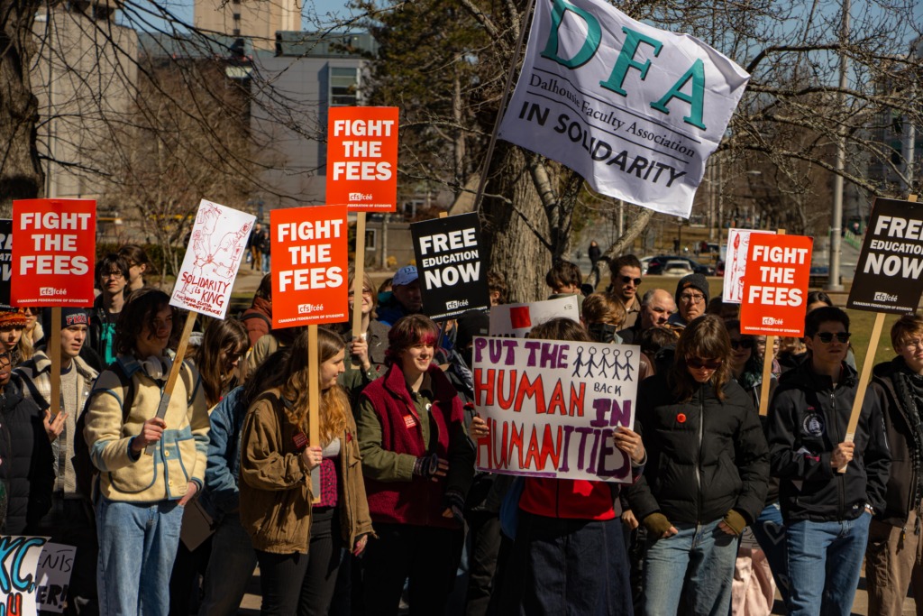 University students from across Nova Scotia gathered outside Dalhousie University’s Henry Hicks Building on March 18, rallying for tuition affordability and divestment from entities they deem unethical.