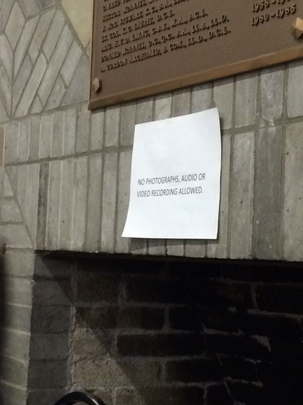 It’s prohibited to record meetings of Dalhousie Senate, as shown by this sign. This means reporters are unable to provide verification when describing what they witness at these meetings. (Photo from Twitter)