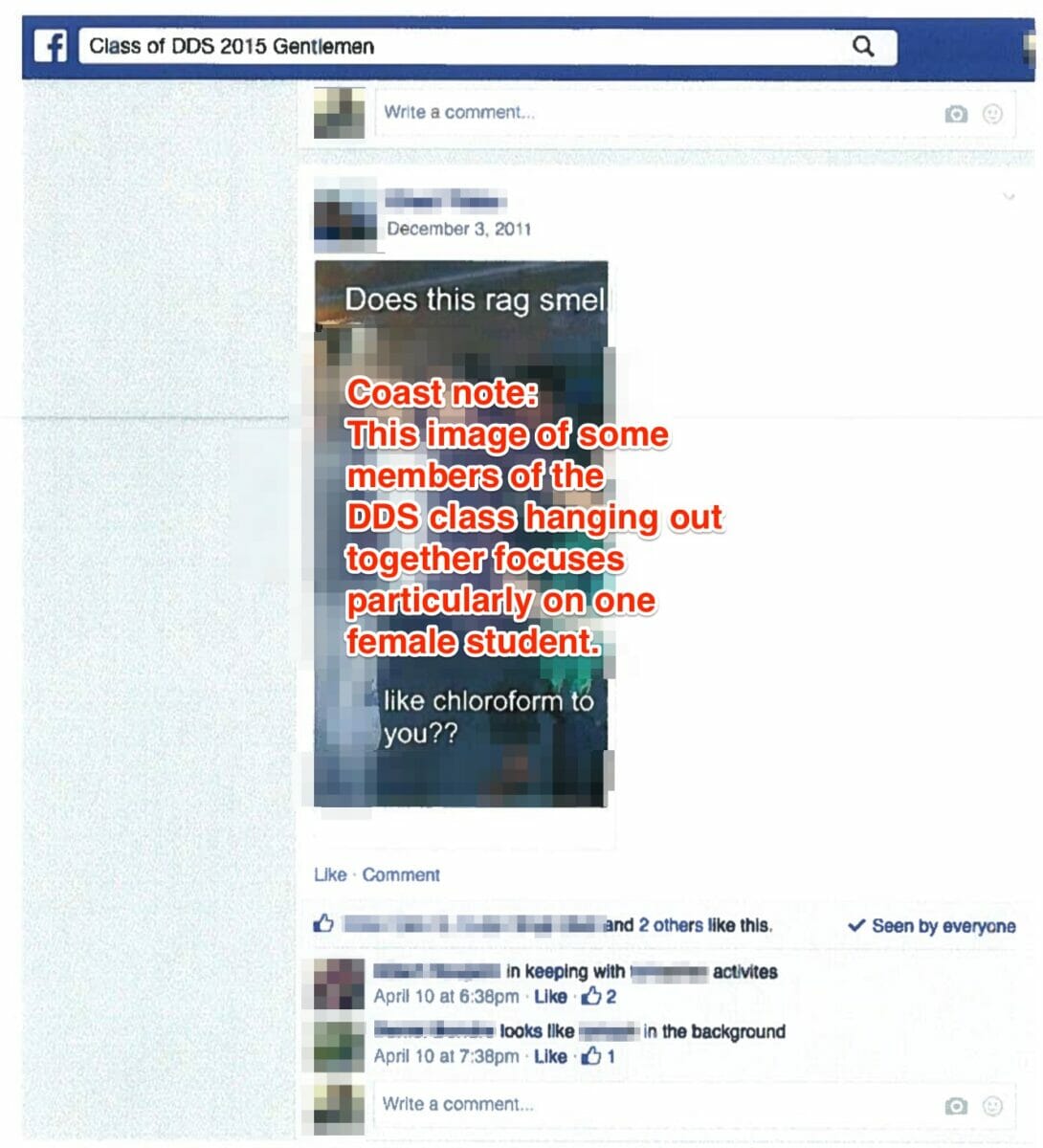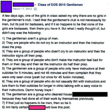 We’ve seen screenshots of posts in the Gentlemen group that are sexist towards all women in the DDS4 class – for example, the post implying all women in the class are “damn honey traps” – meaning all women in the DDS4 class were targeted.